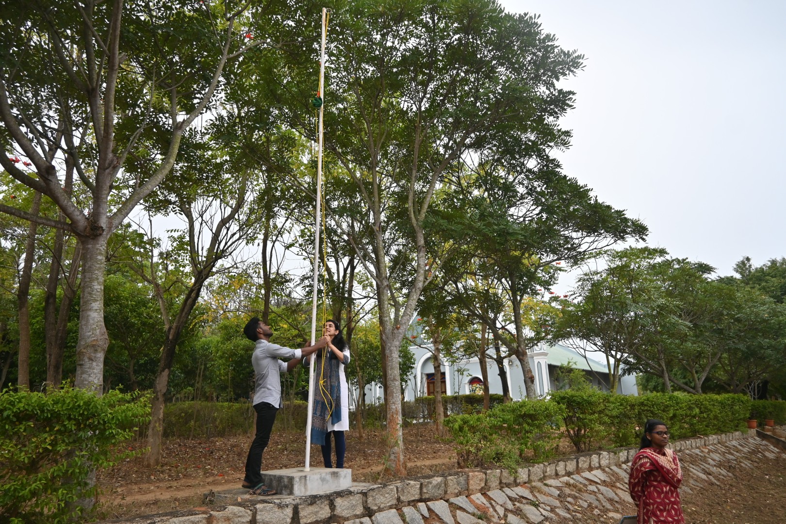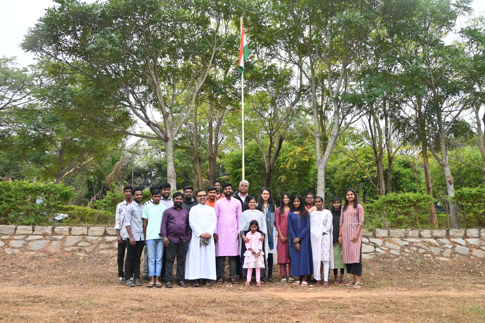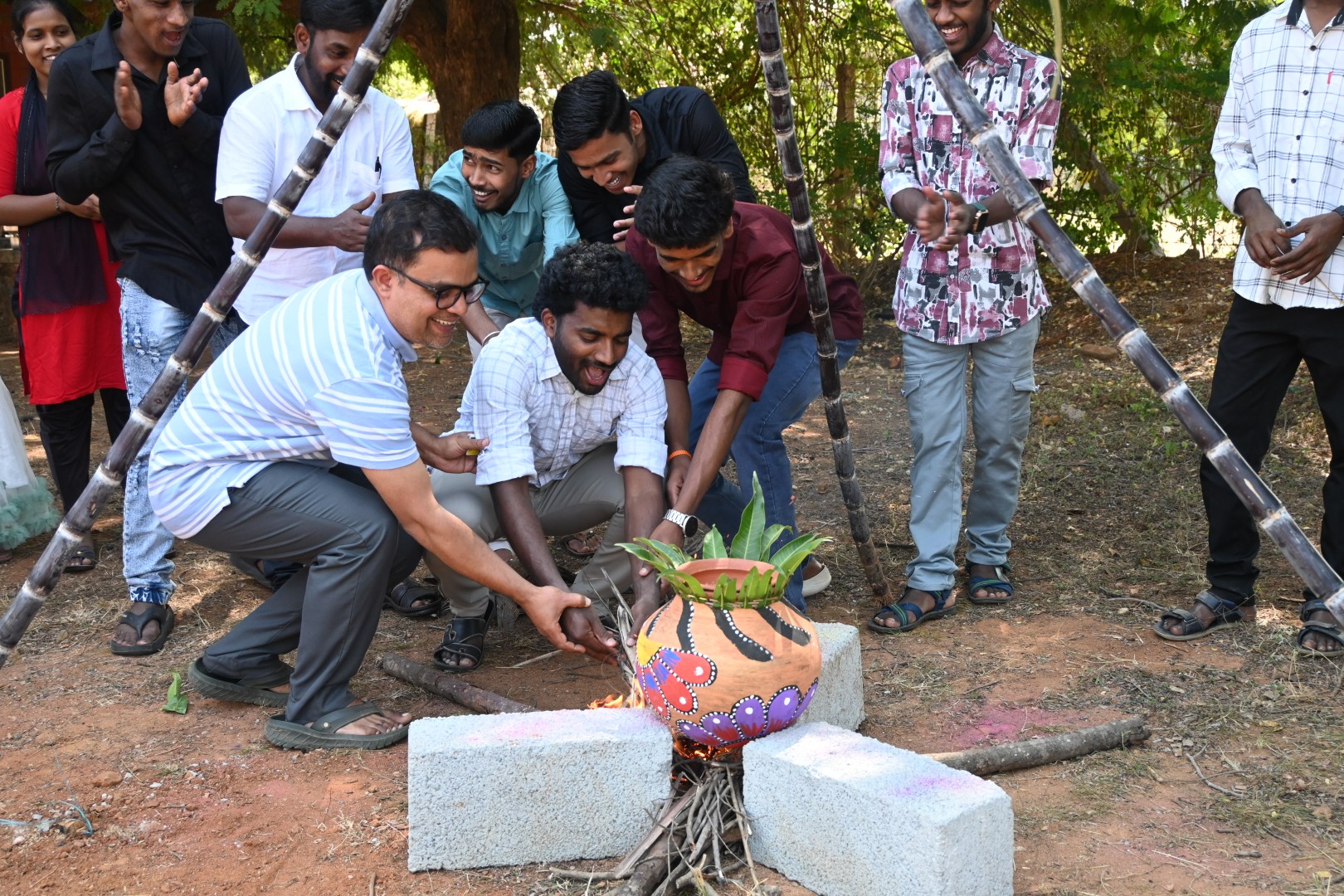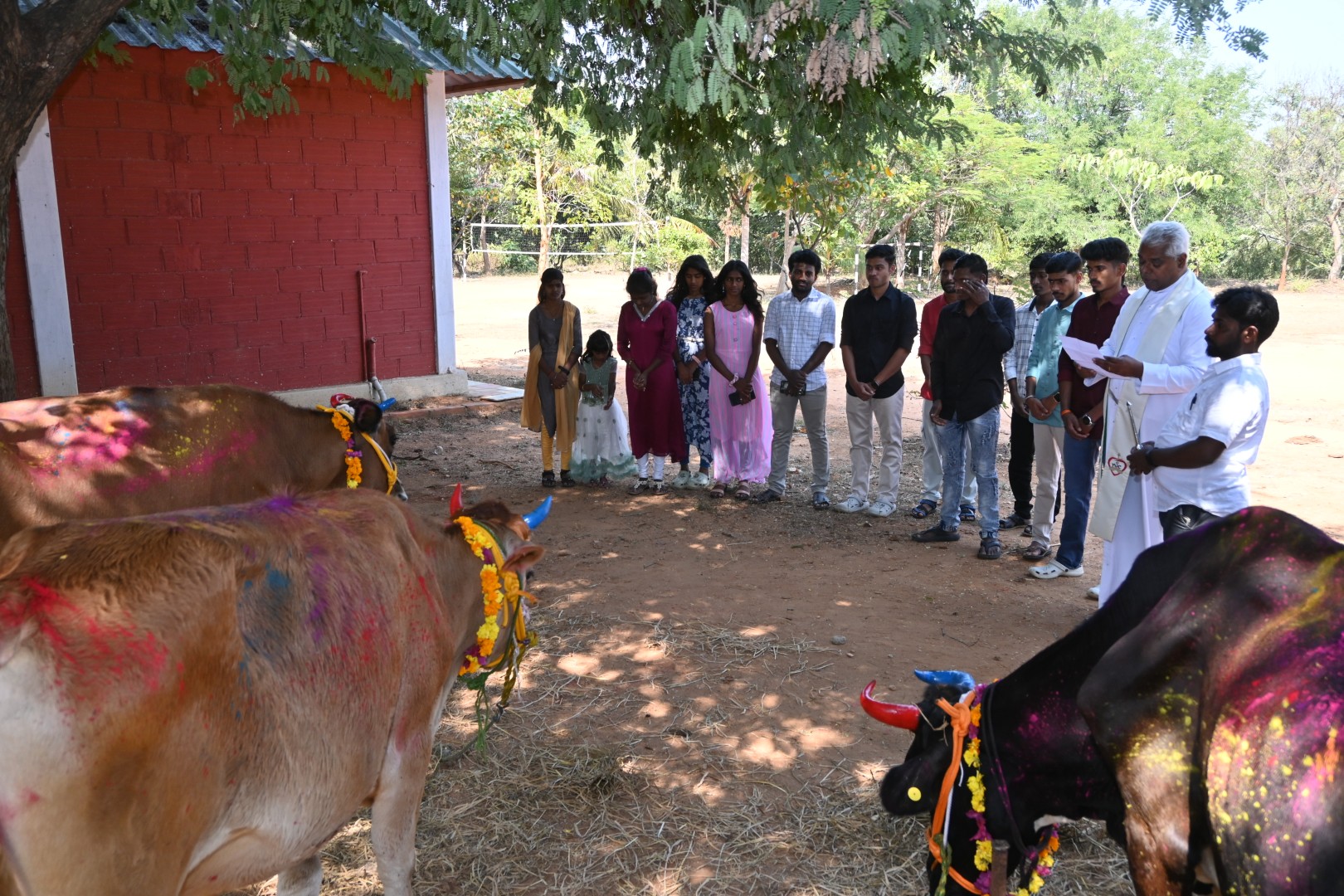 Sweet and savory Pongal were prepared using freshly harvested vegetables from the campus farm. Sugarcane was shared among residents, reinforcing the harvest spirit. The cows were washed, decorated, and blessed in recognition of their role in agriculture.
